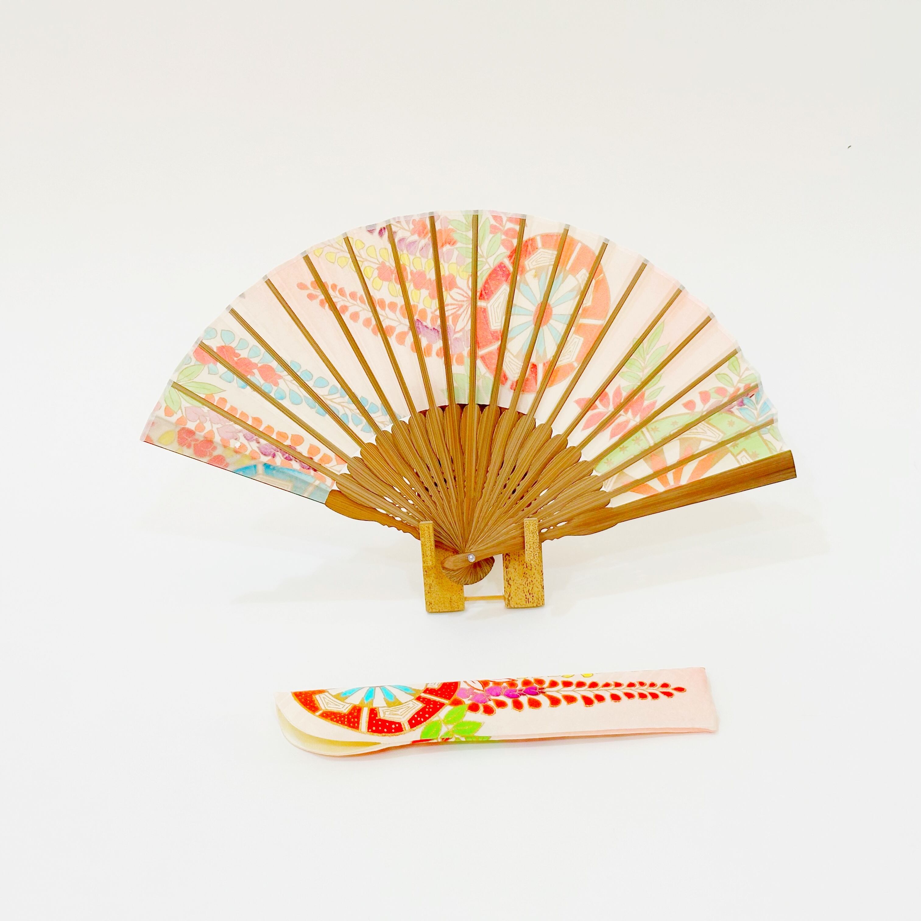 A Kimono fan made from "kimono" fabric with fan bag.